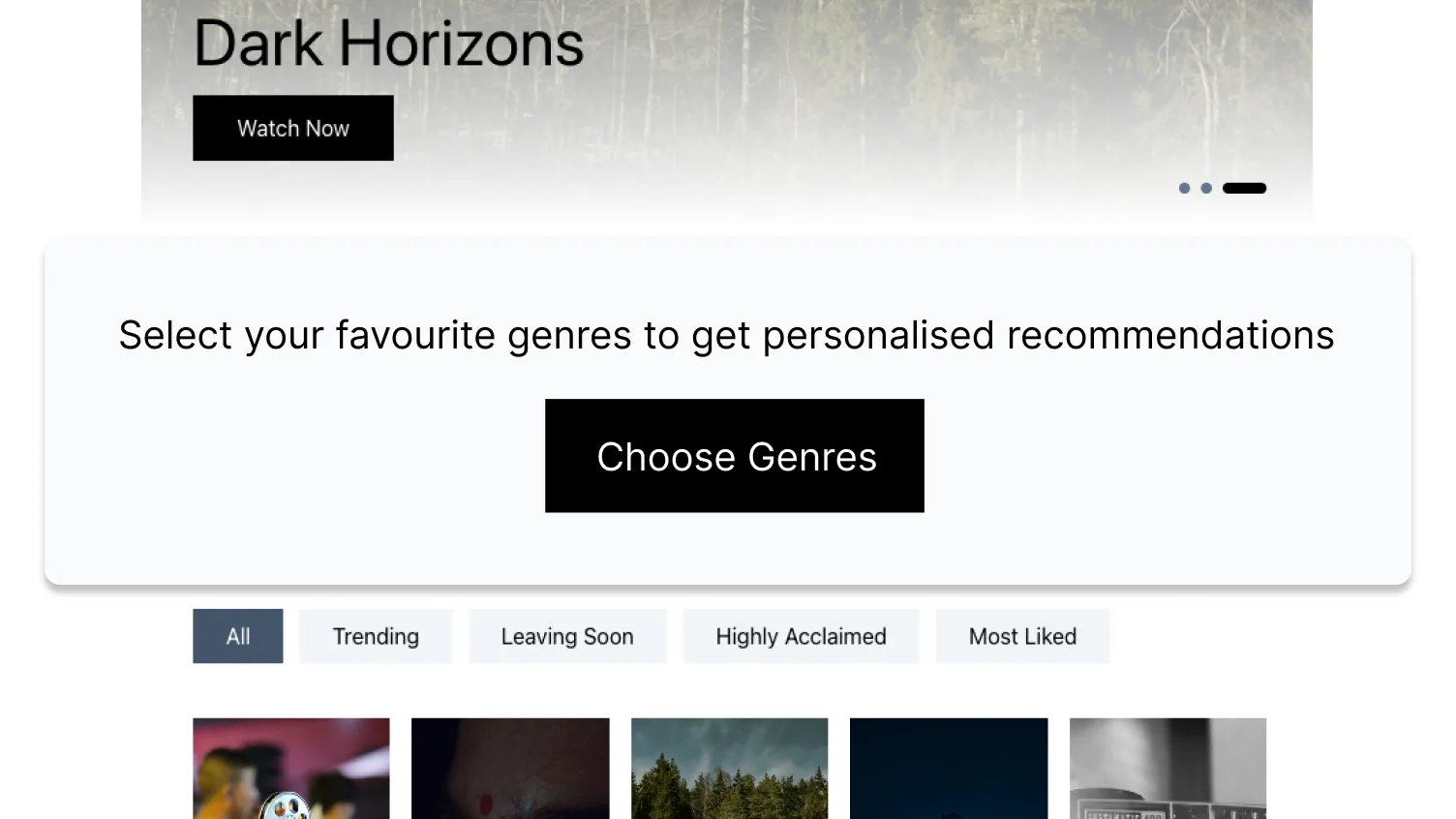 To solve this, the genre preference step is designed as a standalone interaction that can surface in two contexts: during sign-up for new users, and as a contextual prompt on the browse screen for existing users who don't yet have preferences set. The prompt is non-blocking and dismissable, but positioned at the moment a user is actively looking for something to watch — when it's most relevant.
