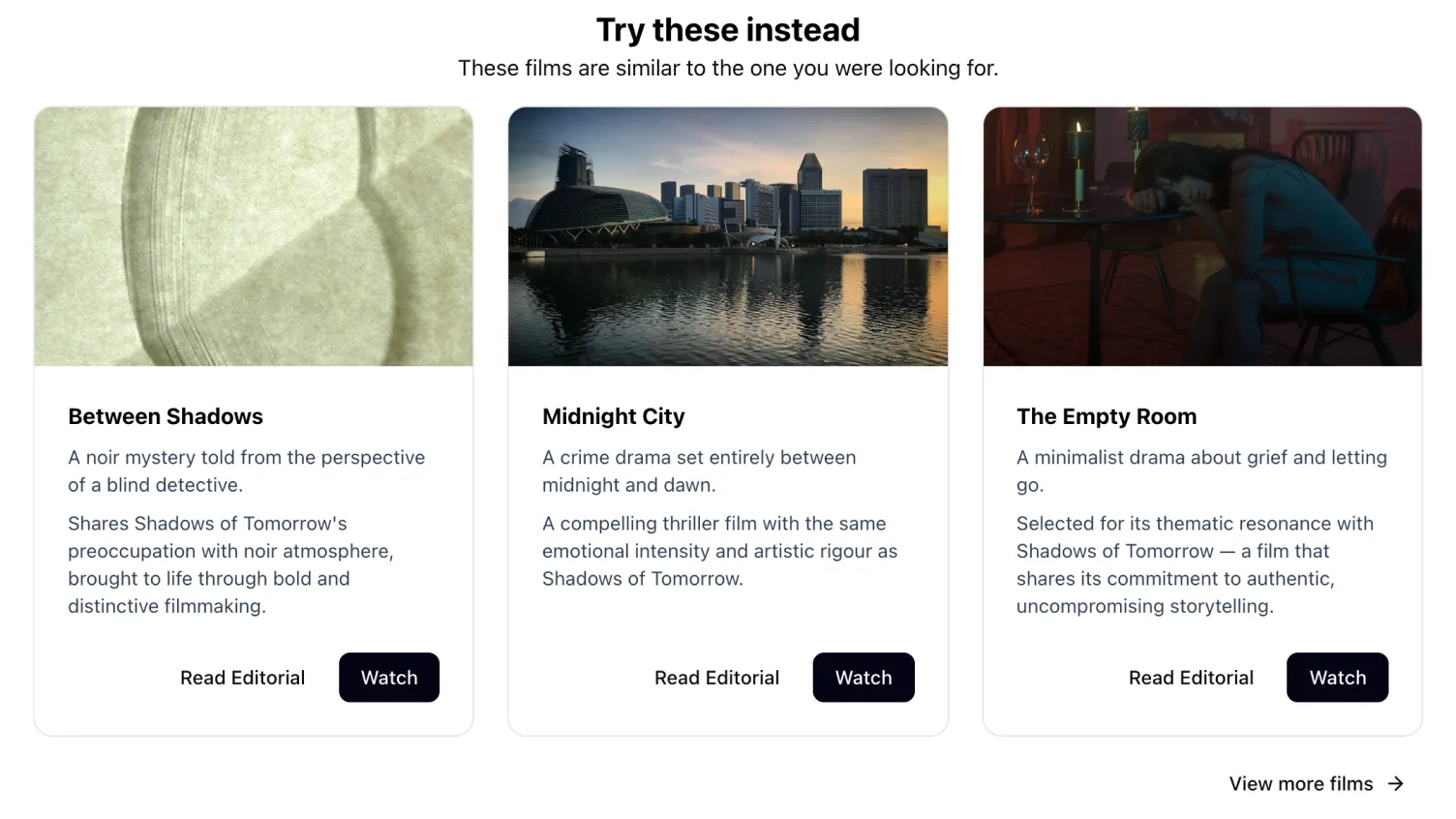 I proposed a deep-link feature that detects when a linked film has expired and uses retrieval-augmented generation (RAG) to recover the moment. The system compares the original editorial text of the expired film against the editorials of all currently available titles using semantic similarity. It then surfaces three alternative recommendations ranked by relevance.